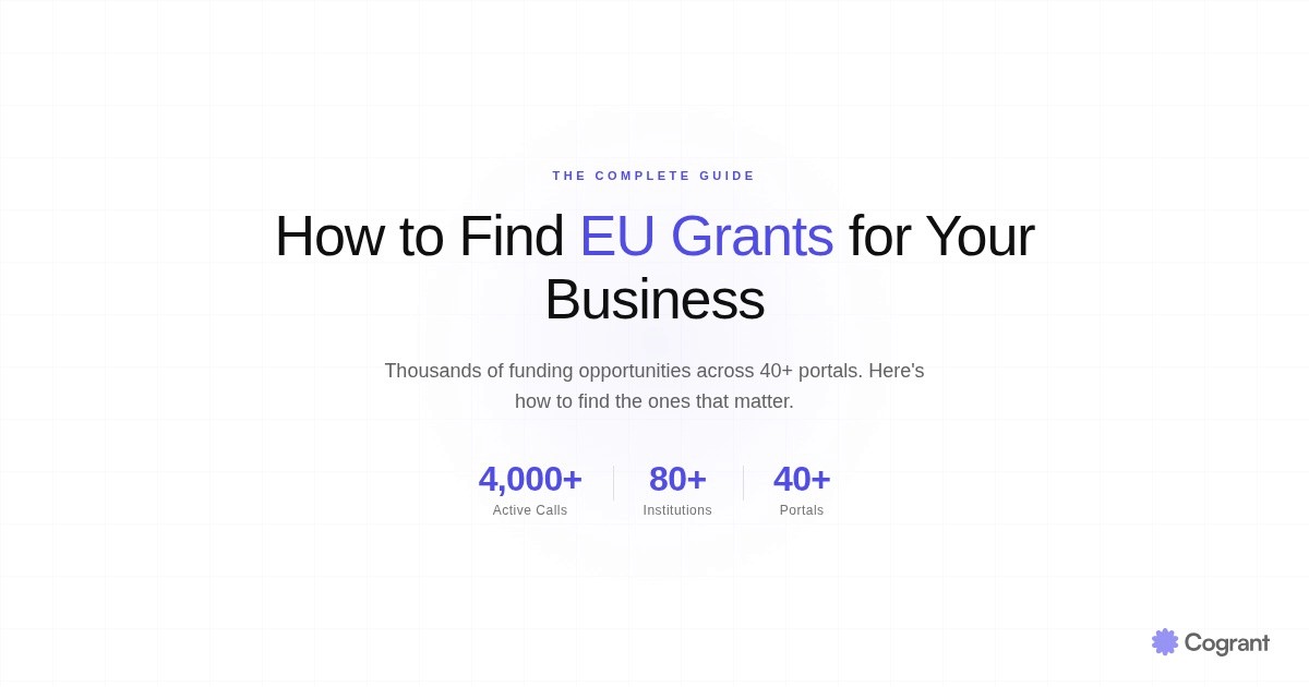 To find EU grants for your business, start by identifying your company's profile (size, sector, innovation stage) and then systematically search the EU Funding & Tenders Portal, national funding agency websites, and programme-specific databases. Most businesses miss relevant grants because opportunities are scattered across 40+ separate portals and institutions — using a structured approach or a grant monitoring service eliminates blind spots.